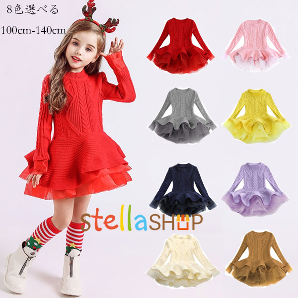 プリンセス ワンピース 女の子 ニット 新年 クリスマス プレゼント 誕生日 結婚式 レッド グレー ネイビー ページュ ピンク イエロー キャメル 暖かい かわいい パープル