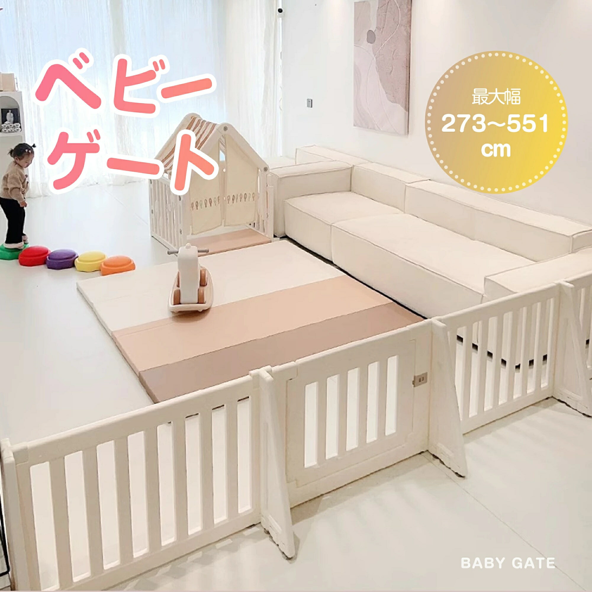 組み合わせ自由自在 最大273!字・コ字・一直線に変形できる自立式ベビーゲート 。ベビーの安全のため、安心できるスペースをつくります。
