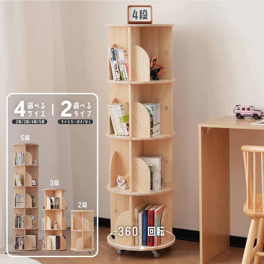 回転式本棚 絵本棚 木製 二段 三段 四段 五段 子供 A4対応 キャスター付き ブックシェルフ 飾り棚 回転本棚 天然木 スリム コミック収納棚 絵本 漫画 回転ラック おもちゃ ディ DVDラック