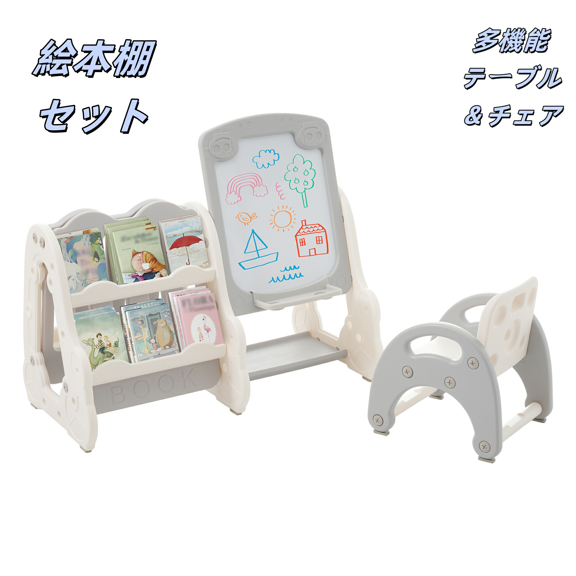 絵本棚セット 椅子付き ホワイトボード付き 多機能テーブル&チェア 知育デスク 収納付き 学習 おもちゃ収納 ラック 本棚 子供用シェルフ 収納棚 おもちゃ 収納 子供部屋 コンパクト 小 おもちゃ箱