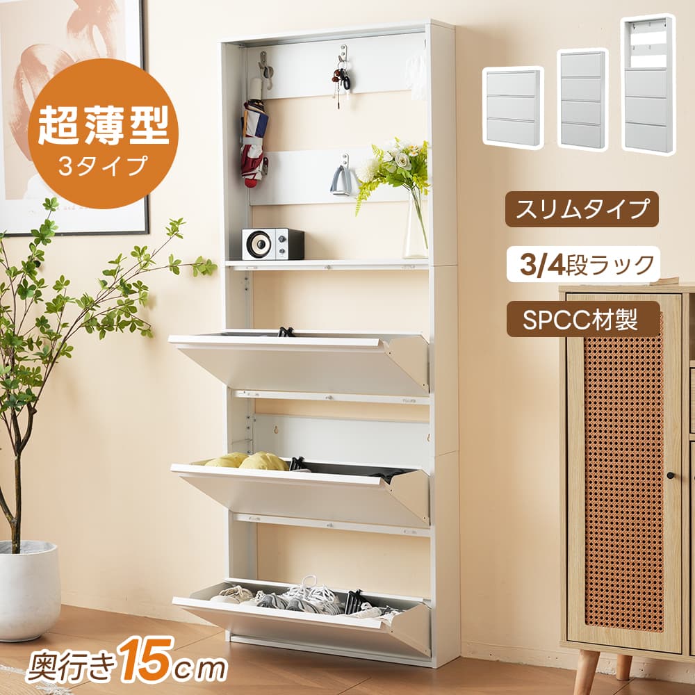 シューズボックス スリム 薄型 奥行15cm 3段 4段 省スペース 靴箱 フック付き シューズラック 超薄型 シューズ収納 大容量 収納棚 くつ箱 下足箱 下駄箱 収納ラック 靴収納 靴入れ