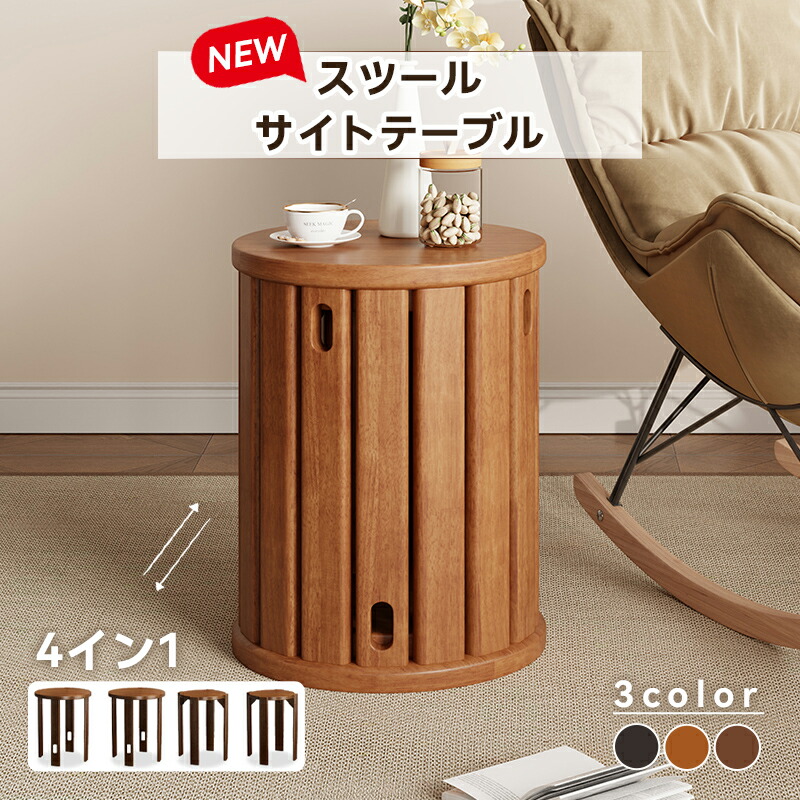 サイドテーブル 天然木 スツール 円形 4脚セット 台がキャスター付き 椅子 組立不要 組み合わせ式 チェア コーヒーテーブル ベッドサイドテーブル リビング 完成品
