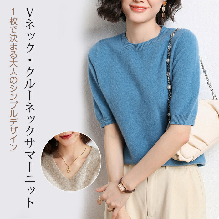 ニット セーター レディース トップス 半袖 Vネック おしゃれ シャツ tシャツ ブラウス 半袖ニット 可愛い カシュクール クルーネック カットソー 柔らか 無地 夏 秋 レ 春