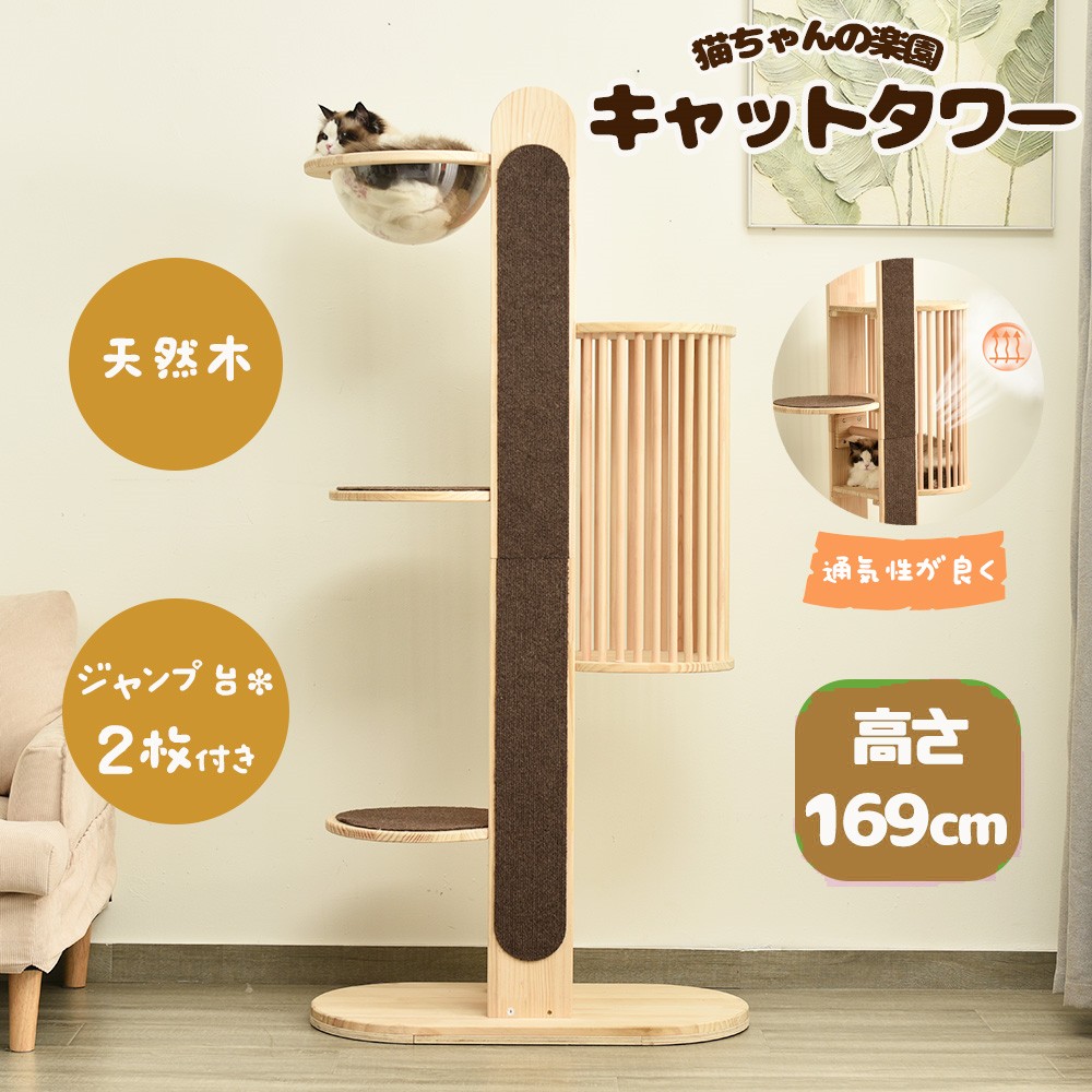 猫用ケージ タワー 猫タワー 据え置き型 木製 宇宙船付き 高さ169cm ネコタワー 隠れ家 爪とぎ ネコ おしゃれ 天然木 多頭飼い 大型猫 子猫 運動 可愛い