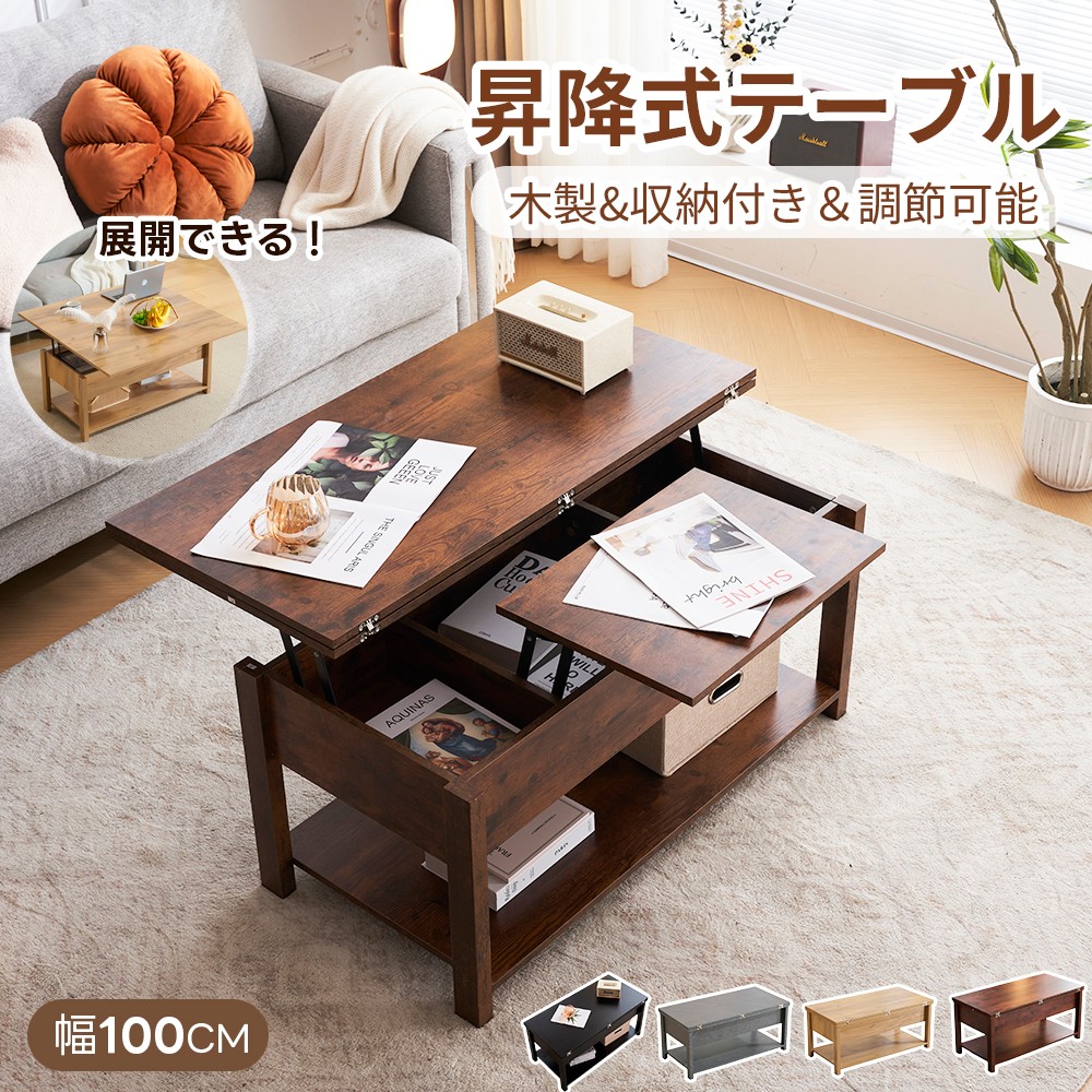昇降式テーブル 幅100 高さ調節 多機能 木製 リフトアップテーブル リフティングテーブル 収納付き ローテーブル セーターテーブル おしゃれ 一人暮らし リビング ダイニングテー リビングテーブル